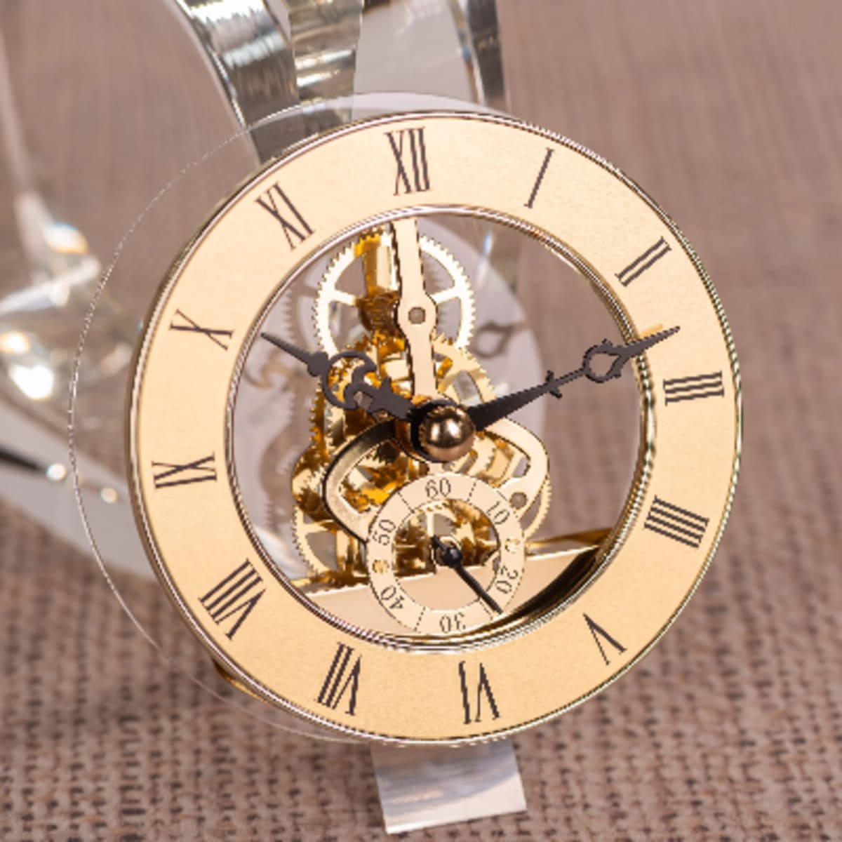 Modern sophistication meets classic precision in Transcendence. This glass-encased clock, accented in gold and black, captures the poetry of time through its intricate inner mechanism.