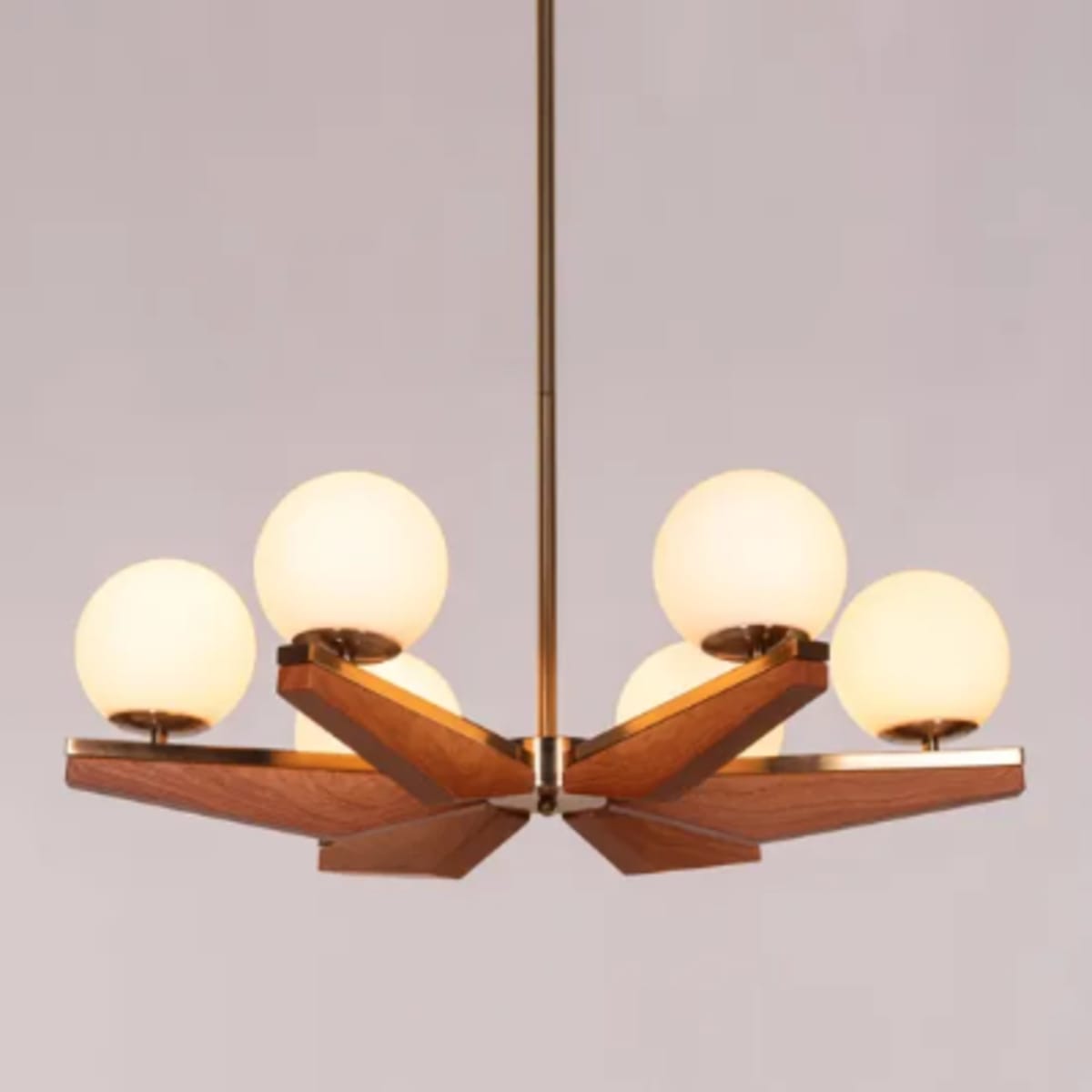 A masterful interplay of natural warmth and golden grandeur, the Heading Home chandelier marries sculpted wood accents with frosted glass globes. It exudes an inviting glow reminiscent of candlelit evenings and understated luxury.