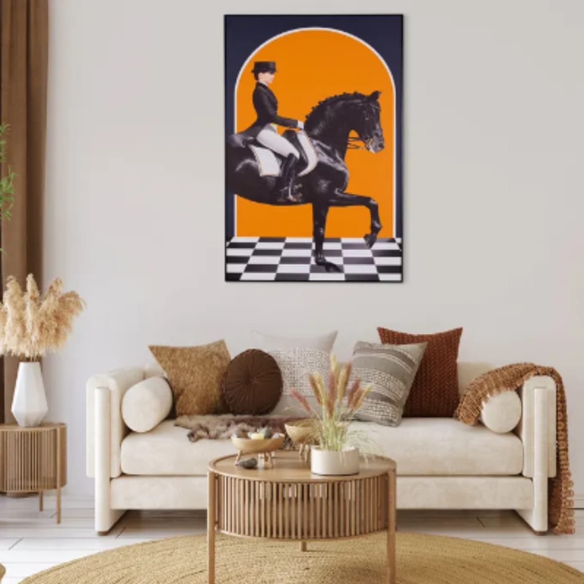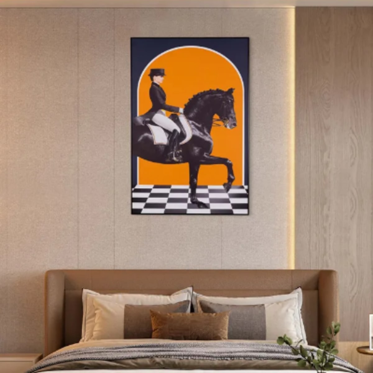 Our Quiet Luxury series celebrates the essence of equestrian sports. This masterpiece showcases a female rider on the back of a black horse.
